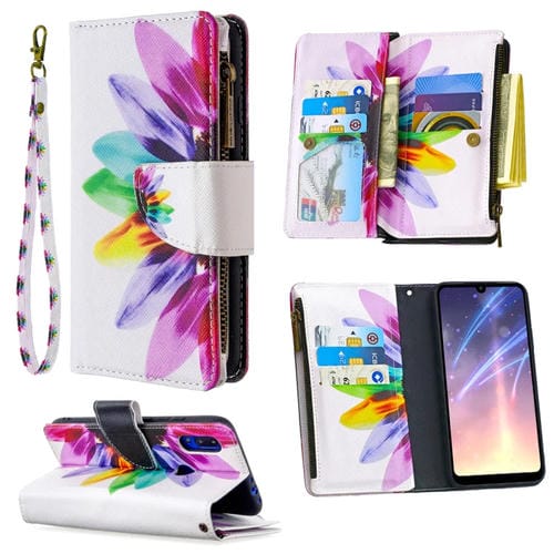 Para Xiaomi Redmi 7 Patrón de Dibujo de Colores Cremallera Funda de Cuero con Tapa Horizontal con Soporte, Ranuras para Tarjetas y Billetera (Sun Flower)