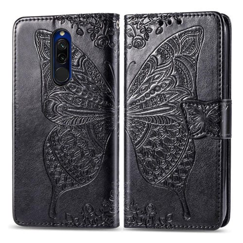 Para Xiaomi Redmi 8 Butterfly Love Flower Estuche de Cuero con Tapa Horizontal En Relieve con Soporte Ranura para Tarjeta con Cordón Monedero (Negro)