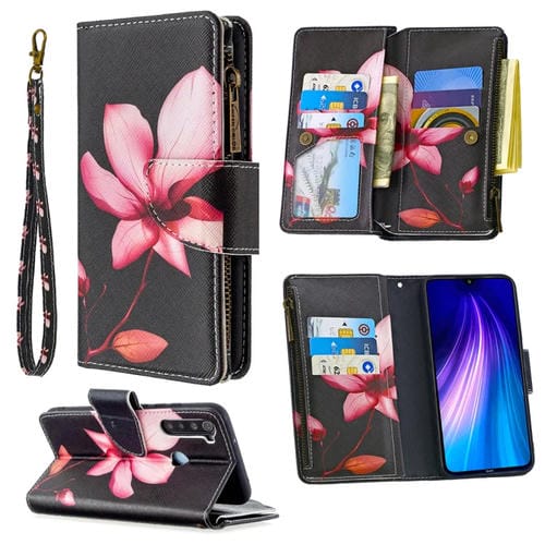 Para Xiaomi Redmi Note 8 Patrón de Dibujo de Colores Cremallera Funda de Cuero con Tapa Horizontal con Soporte, Ranuras para Tarjetas y Billetera (Lotus)