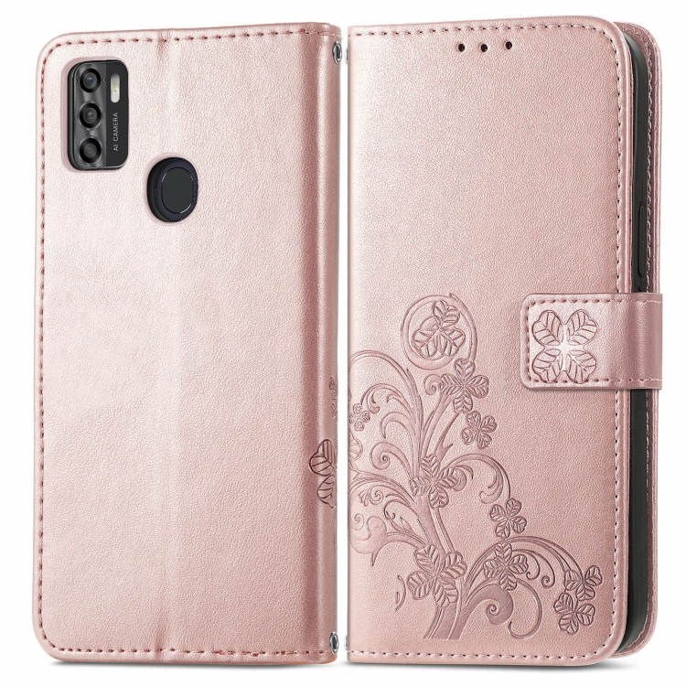 Para ZTE A7S 2020 Cierre de cuatro hojas con hebilla en relieve Protección de teléfono móvil Funda de cuero con cortante y ranura de tarjeta y función de soporte y soporte (oro rosa)