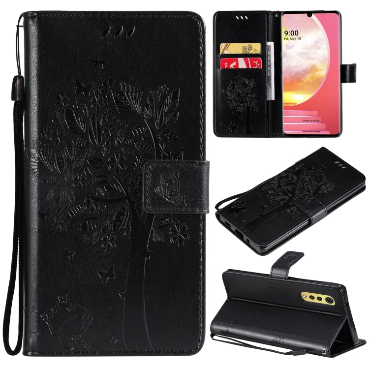 Funda de Cuero PU LG Velvet 2 Pro con Patrón Árbol y Gato, Soporte, Tarjetero y Cordón (Negro)