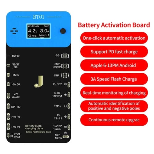 • Entrada de interfaz tipo C compatible con Carga rápida PD; Pantalla OLED HD de 0,8 pulgadas; indicador de zumbador incorporado; activación automática de una Tecla; identificación automática de polaridad; monitoreo en tiempo real del voltaje y salud de la Batería; Soporte para actualización remota vía plataforma JCID; simulación de esquema de Carga para Carga rápida segura