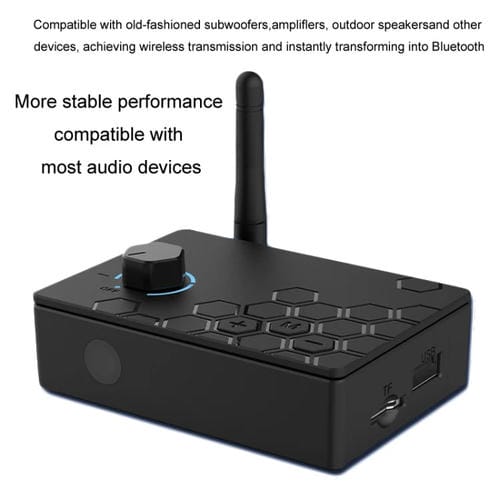 - Entrada de energía: 5V; interfaz de salida auxiliar de 3,5 mm; modos de operación: coaxial, fibra óptica, Disco USB, Bluetooth; control remoto con Batería de Botón; radio de trabajo efectivo de 15 m; soporta formatos WAV, FLAC, MP3, APE, MAV