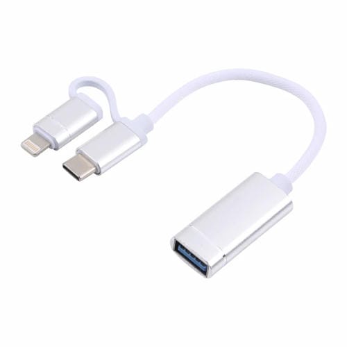 Cable Adaptador Usb 3.0 Hembra A 8 Pin + Usb-C Tipo C Carga Masculina Transmisión Otg Nylon (11 cm) (Plata)