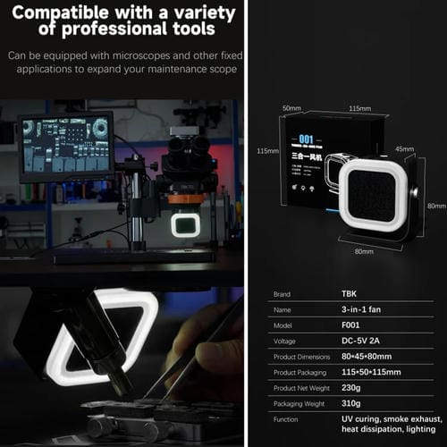 El Ventilador extractor de humo multifuncional TBK F001 es un equipo profesional diseñado para optimizar procesos de reparación y mantenimiento que requieren control de humo, curado por luz ultravioleta (UV) y filtración de aire. Este dispositivo 3 en 1 integra un Ventilador de alta velocidad sin escobillas que alcanza hasta 15,000 revoluciones por minuto, una lámpara de curado UV con doble perla para un secado eficiente de Adhesivos y una filtración de carbón activado que elimina gases nocivos generados durante el trabajo. Su diseño compacto y versátil permite su uso junto con microscopios y otras herramientas profesionales, ampliando su funcionalidad para diferentes aplicaciones Técnicas. El TBK F001 es compatible con múltiples entornos de reparación y garantiza un ambiente de trabajo seguro y confortable gracias a su sistema integrado de escape de humo y disipación térmica.