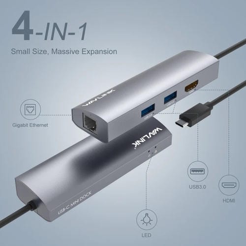 - 1x Adaptador Hub USB 4 en 1 Wavlink WL-UHP3408 Tipo-C a HDMI, 2x USB 3.0 y Estación de Acoplamiento Gigabit RJ45