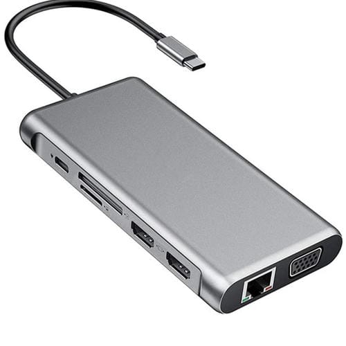 El Hub Estación de Acoplamiento 12 en 1 Tipo-C USB-C en color Gris Oscuro es un accesorio multifuncional diseñado para ampliar la conectividad de dispositivos con Puerto USB-C, incluyendo Computadoras Portátiles, PC y Teléfonos Móviles con Windows. Este hub ofrece una solución integral con 12 Puertos que incluyen doble HDMI, USB 3.0, USB 2.0, Carga PD, VGA, RJ45, jack de 3,5 mm y ranuras para Tarjetas TF y SD, permitiendo la Conexión simultánea de múltiples dispositivos y periféricos. Su construcción en aleación de aluminio garantiza durabilidad y resistencia, mientras que sus capacidades Técnicas soportan resoluciones de hasta 4K para HDMI y 1080p para VGA, además de una transferencia de datos eficiente y Carga rápida mediante protocolo PD3.0.