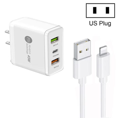 Cargador Usb Multipuerto 45W Pd25W + 2 X Qc3.0 con Cable Usb A 8 Pines (Blanco)