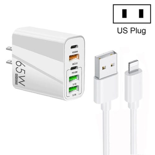 Cargador Multi Puerto 65W Dual PD Type-C + 3 USB con Cable Datos 8 Pines (Blanco)