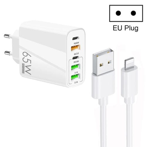 Cargador Multi Puerto 65W Dual PD Type-C 3 USB + Cable 3A 8 Pines (Blanco)