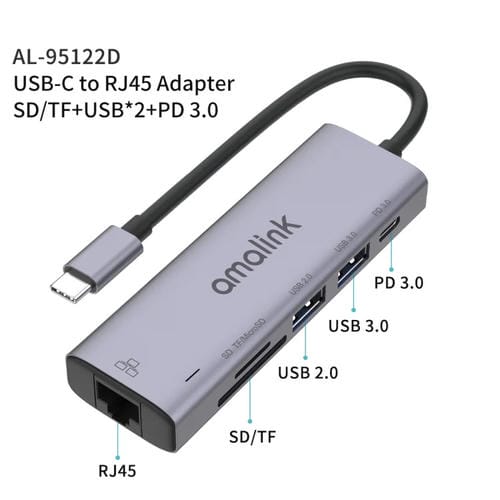 - 1x Hub Multifunción Amalink 95122D Tipo-C / USB-C a RJ45 con 2 Puertos USB y Pd 3.0 (Gris)