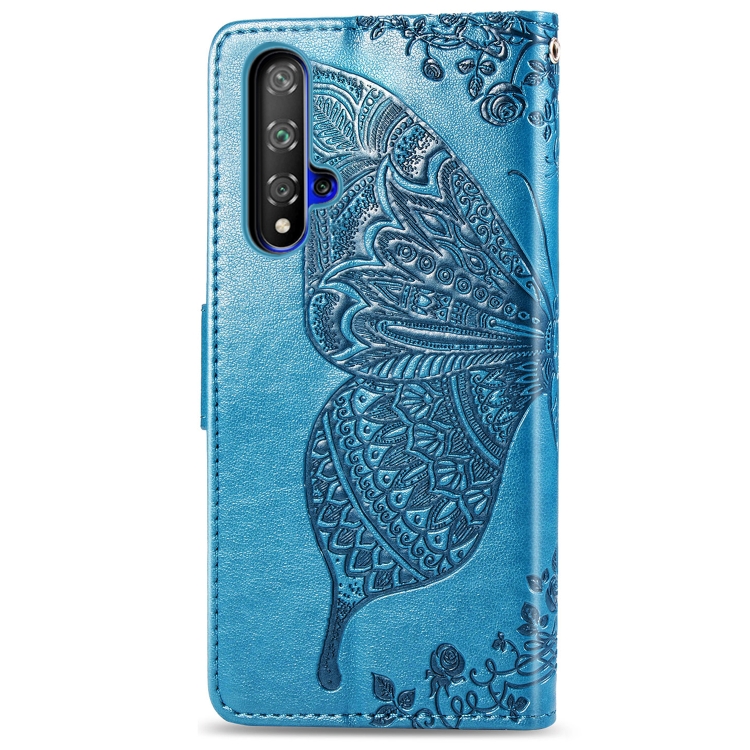 Funda de Cuero Butterfly Love Flowers para Huawei Honor 20 con Tapa Horizontal, Soporte, Ranuras, Billetera y Cordón (Azul)