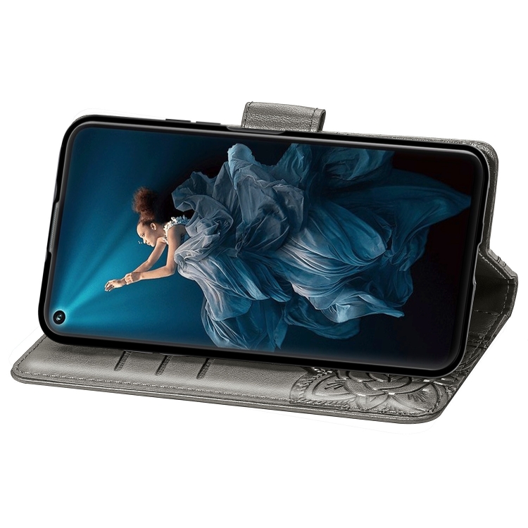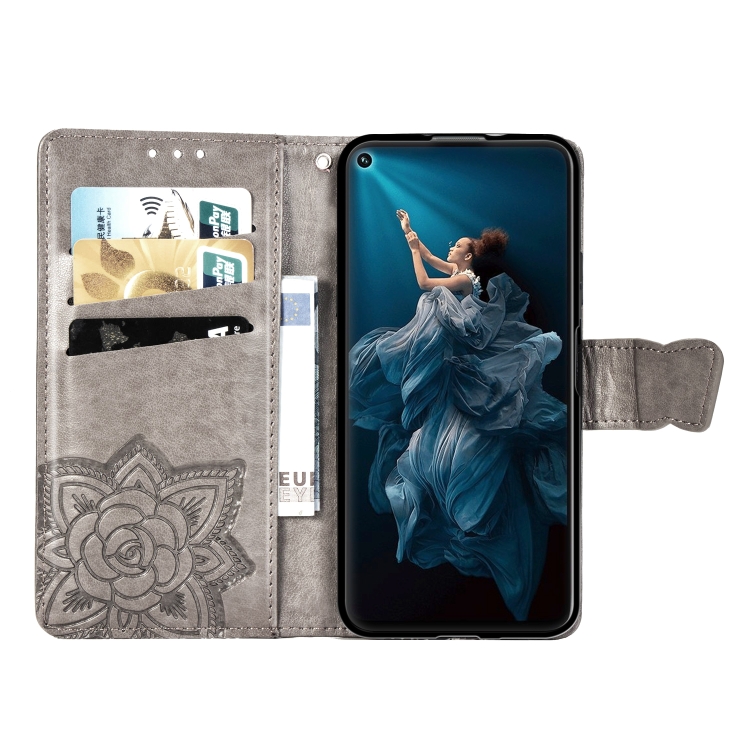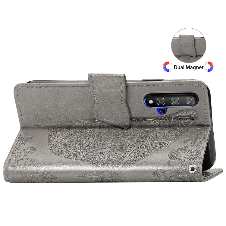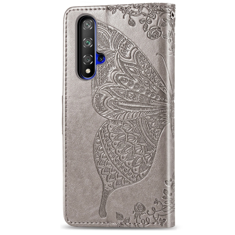 Funda de Cuero Butterfly Love Flowers para Huawei Honor 20 con Soporte, Ranuras, Billetera y Cordón (Gris)