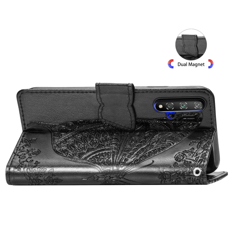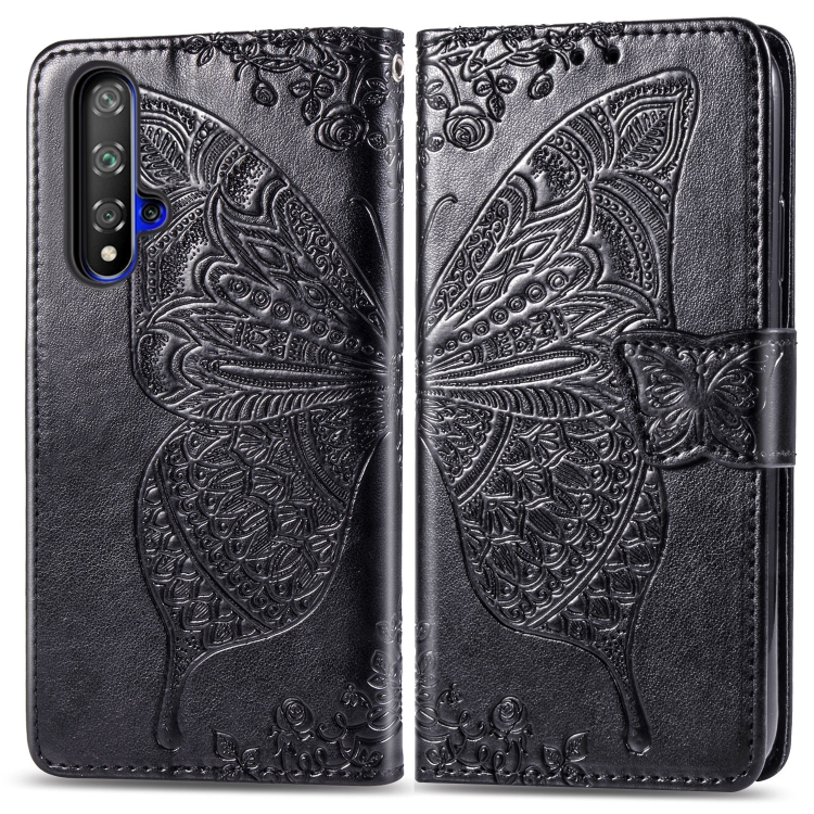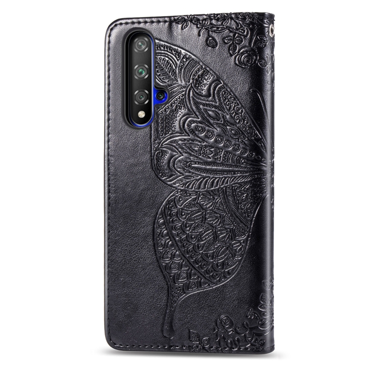 Funda de Cuero Butterfly Love Flowers para Huawei Honor 20 con Soporte, Ranuras y Billetera (Negro)