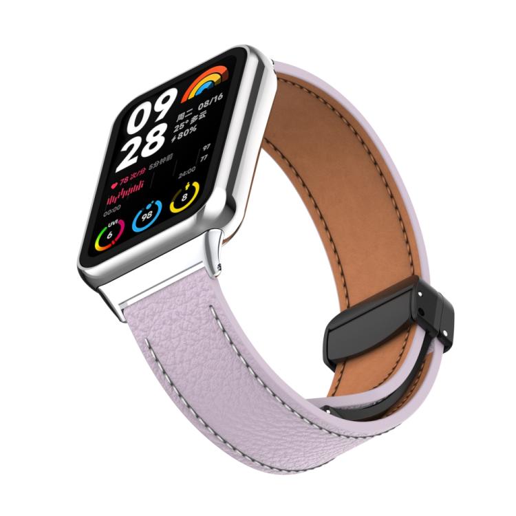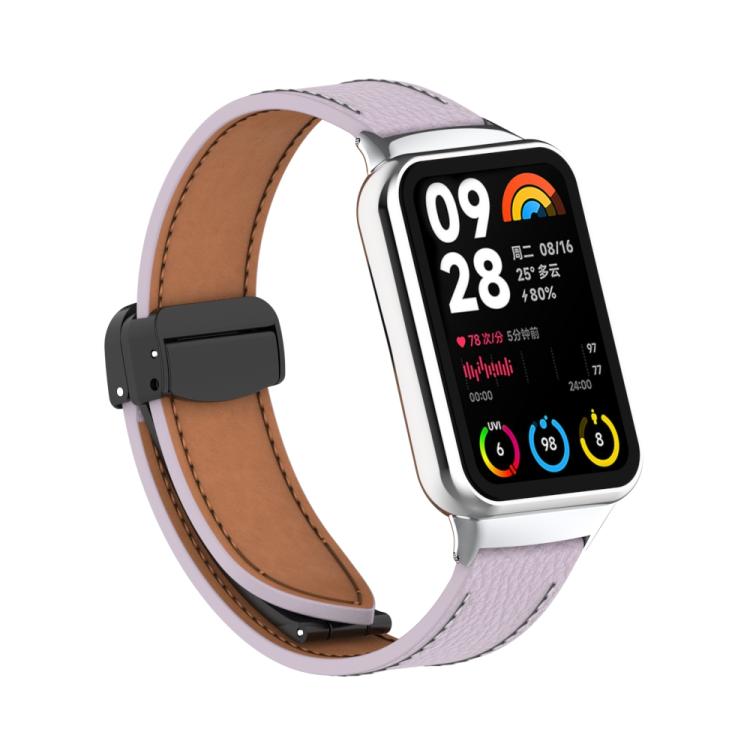 Correa de cuero con hebilla magnética negra y textura de lichi para Xiaomi Smart Band 9 Pro y Redmi Watch 5 (morado)