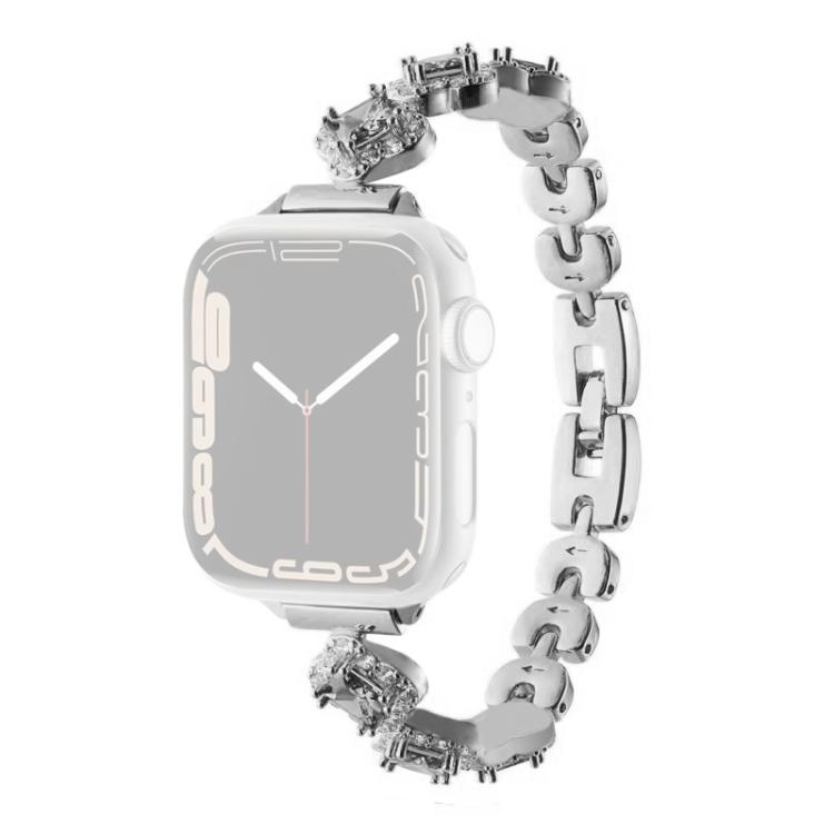 Correa de metal con diamantes y trébol de cuatro hojas para Apple Watch de 42, 44, 45, 46 y 49 mm (plata)