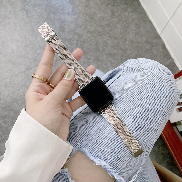 Correa de Reloj de Acero Tres Líneas para Apple Watch Ultra 49mm Serie 8 7 45mm SE 2 6 5 4 3 2 1 42mm (Oro Rosa Plateado)