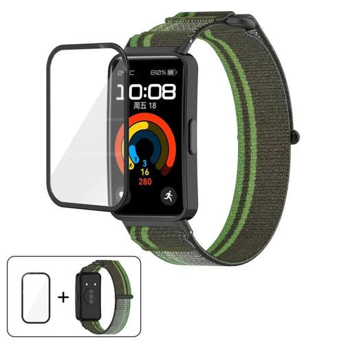 Correa de reloj de nailon con cierre de velcro y película curva 3D para Huawei Band 9/9 NFC Wild Path (verde oscuro)