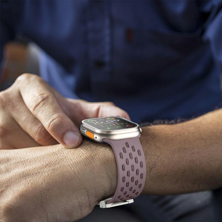 Correa de silicona con hebilla de paraguas plateada Kalebol Mesh para Apple Watch de 46 mm, 49 mm, 45 mm y 44 mm (morado ahumado)