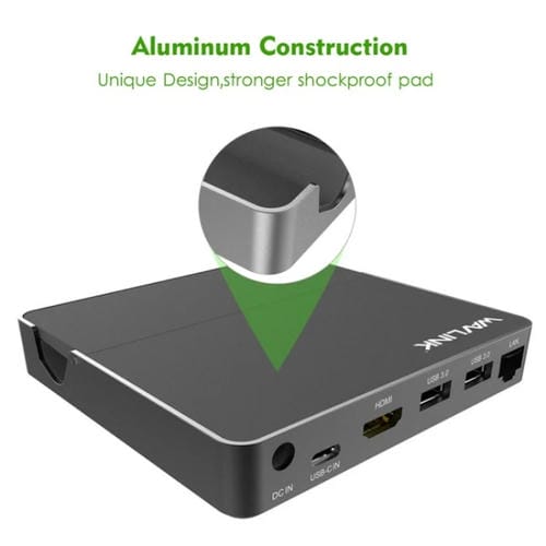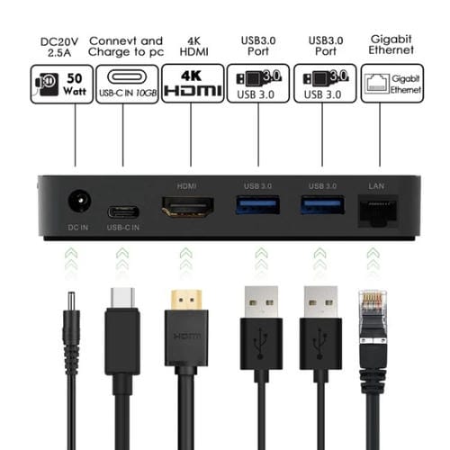 • Incluye 1 Puerto HDMI con salida 4K HD, 2 Puertos USB 3.0, 1 Puerto USB-C de entrada, 1 Puerto Gigabit Ethernet, adaptador de corriente de 36 W, dimensiones 115,5 x 110,5 x 19,5 mm, peso 255 g, voltaje de operación 100-240 V, temperatura de funcionamiento entre 0 y 40 °C