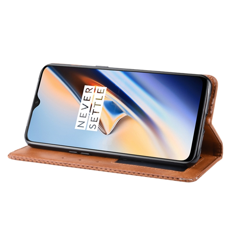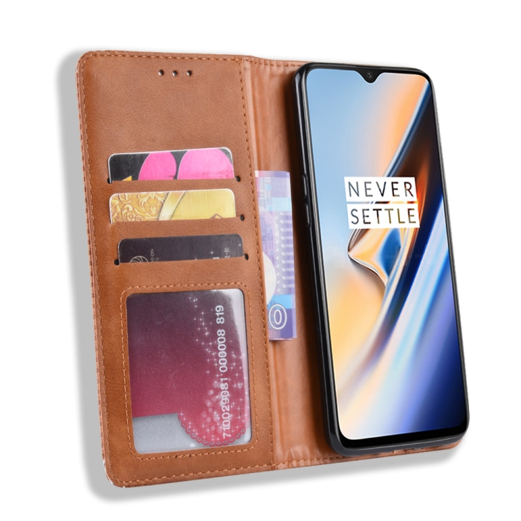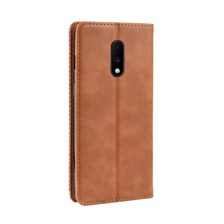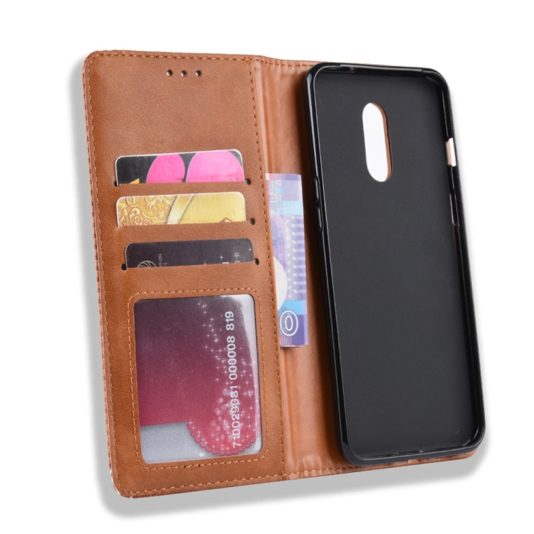 Estuche de Cuero OnePlus 7 con Tapa Horizontal, Hebilla Magnética, Soporte y Ranuras (Marrón)