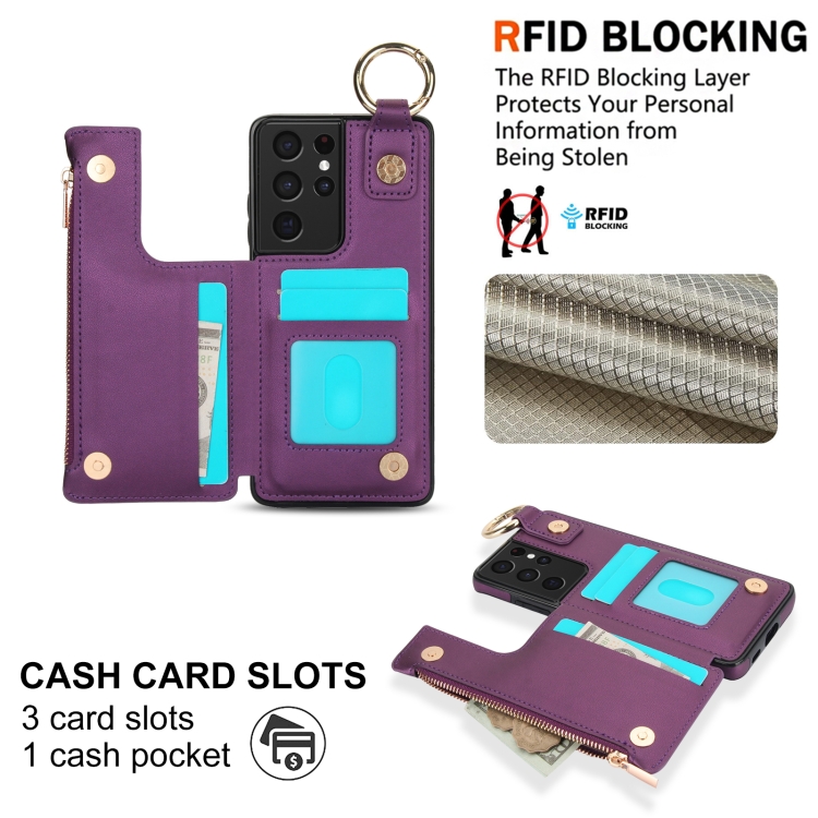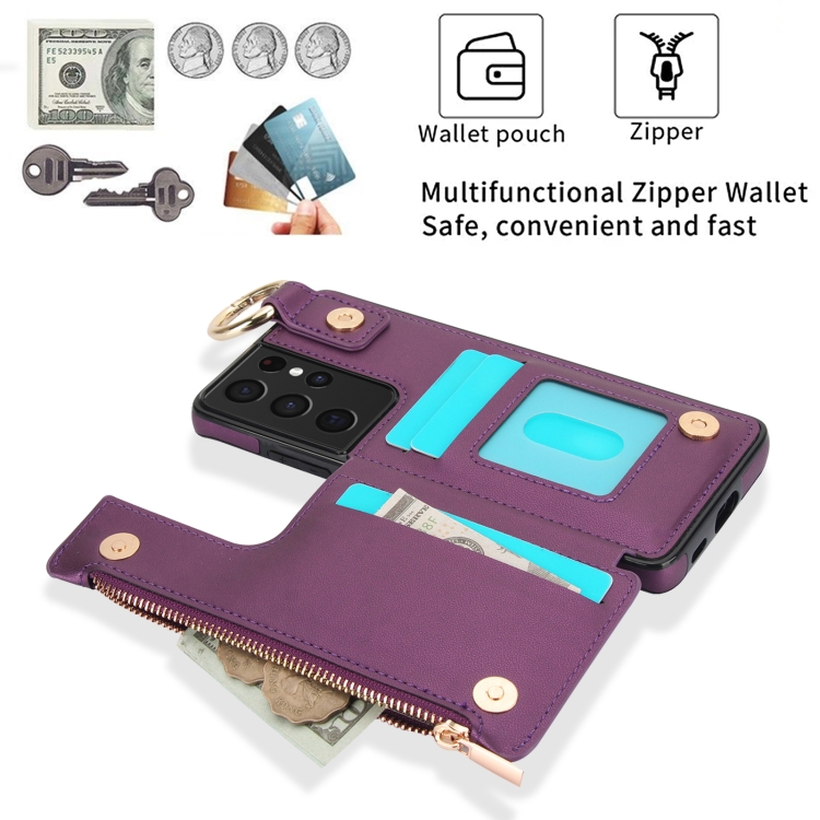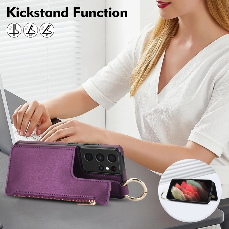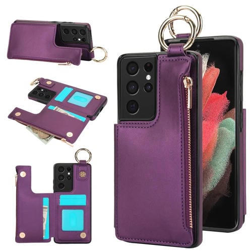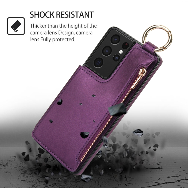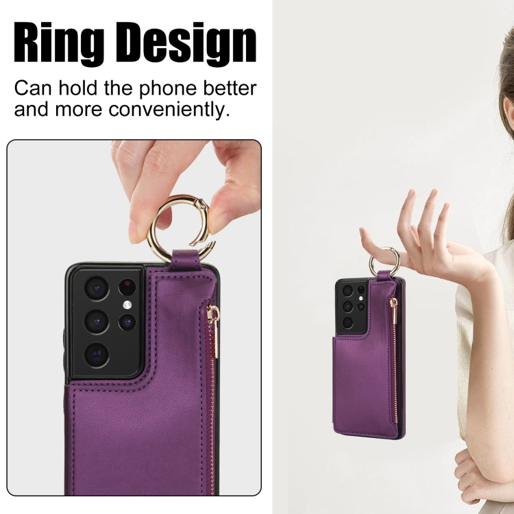 Estuche para Teléfono Samsung Galaxy S21 Ultra 5G Rfld con Cremallera y Anillo de Doble Hebilla Antirrobo (Morado Oscuro)