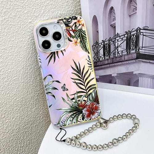 Estuche para Teléfono Apple iPhone 15 Pro Flores Galvanizadas con Láser y Correa para la Muñeca (Hojas Ah12)