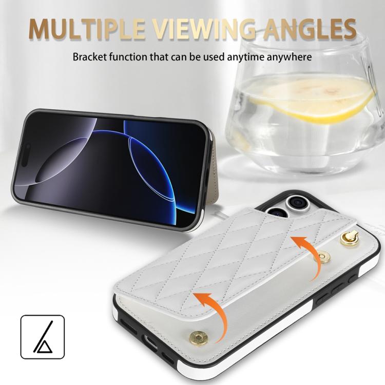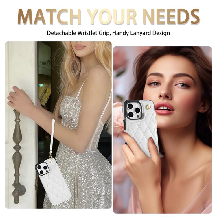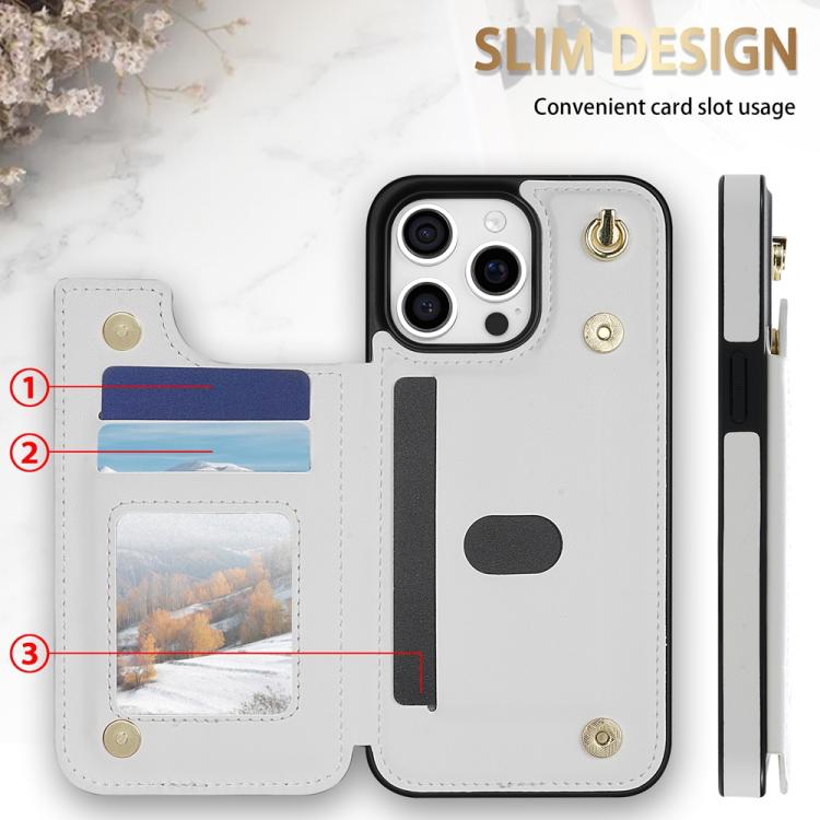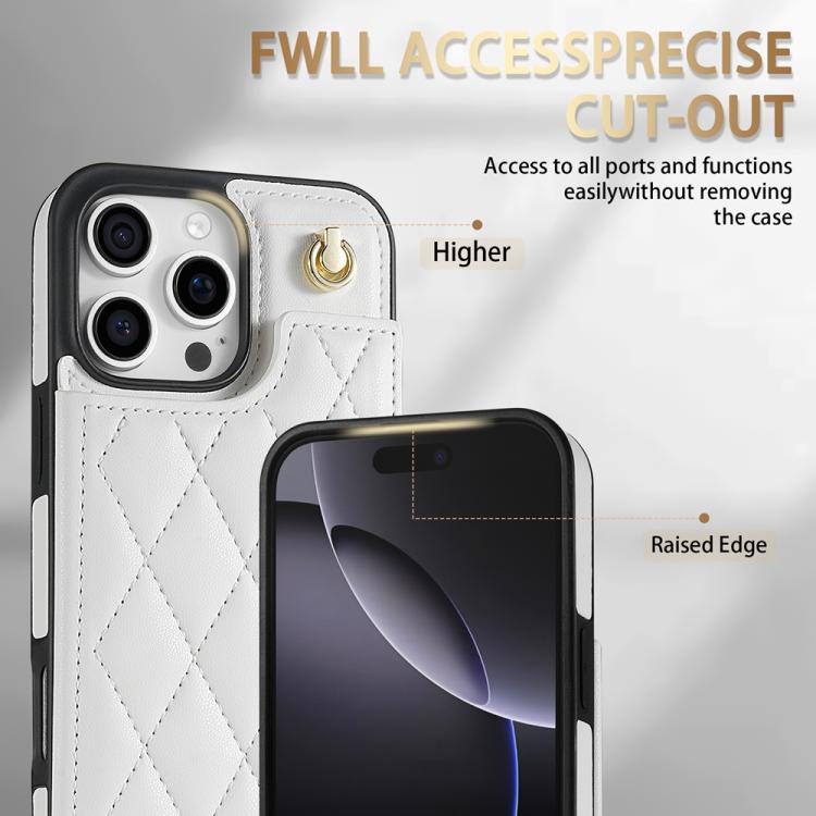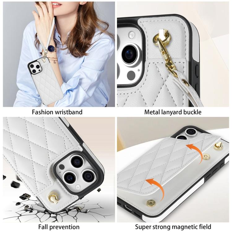 Estuche para teléfono iPhone 13 Pro Max ranuras para tarjetas hebilla doble rombal con cordón (Blanco)