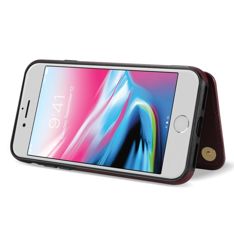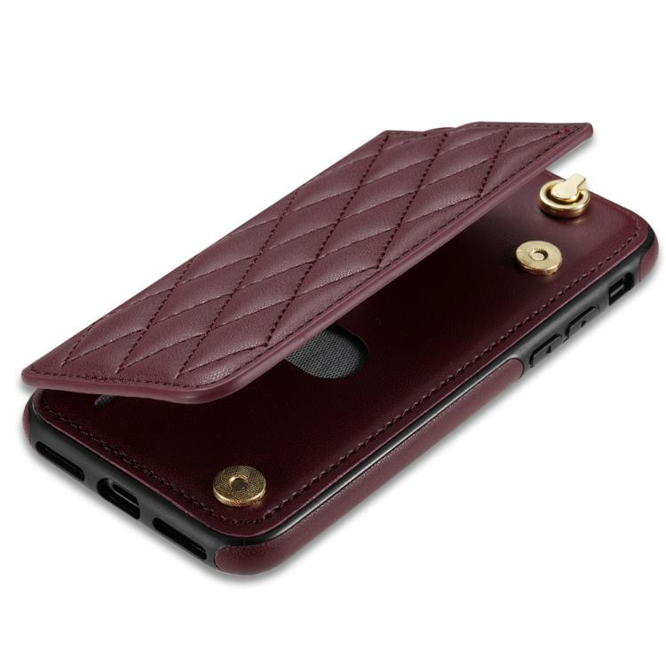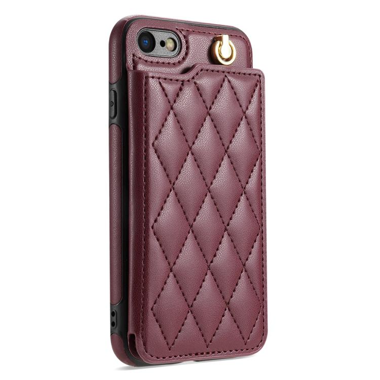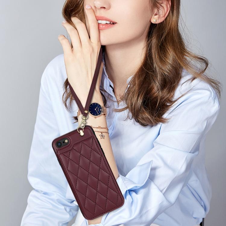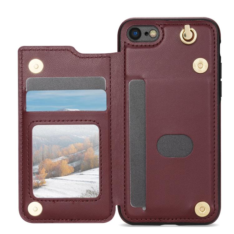 Estuche para Teléfono iPhone 8 Plus/7 Plus con Ranuras para Tarjetas y Hebilla Doble Rombal con Cordón (Rojo Vino)