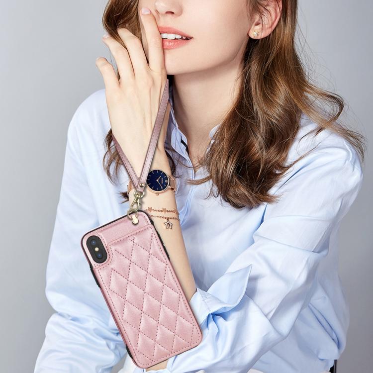 Estuche para Teléfono Rombal iPhone X/Xs Ranuras Tarjetas Hebilla Doble con Cordón (Oro Rosa)