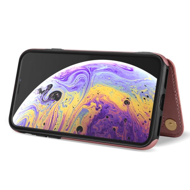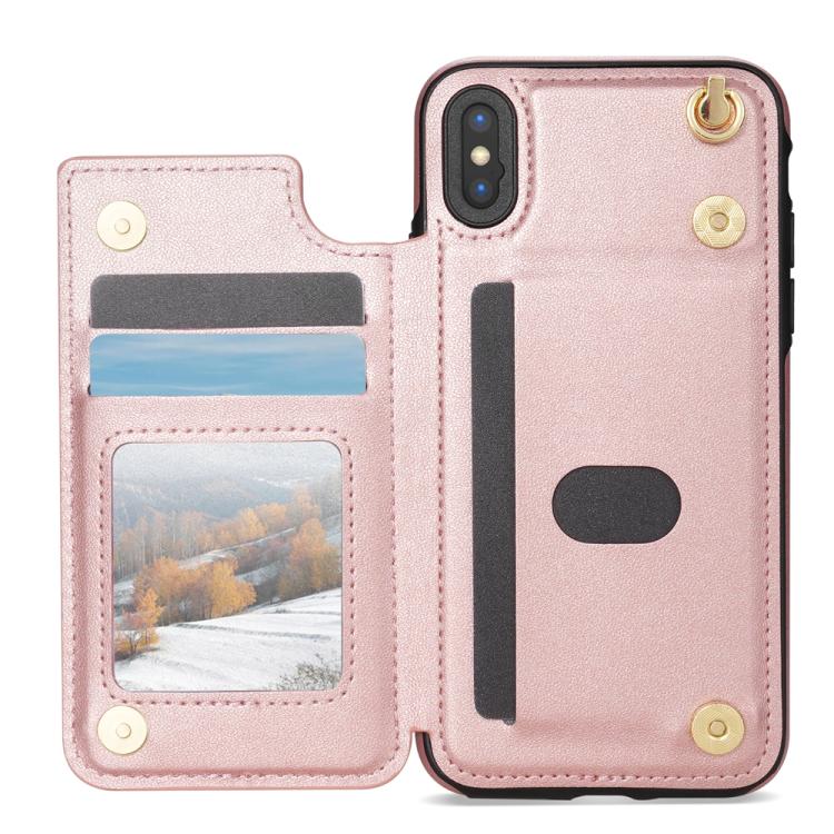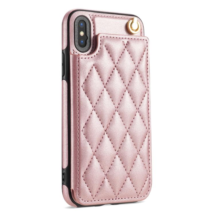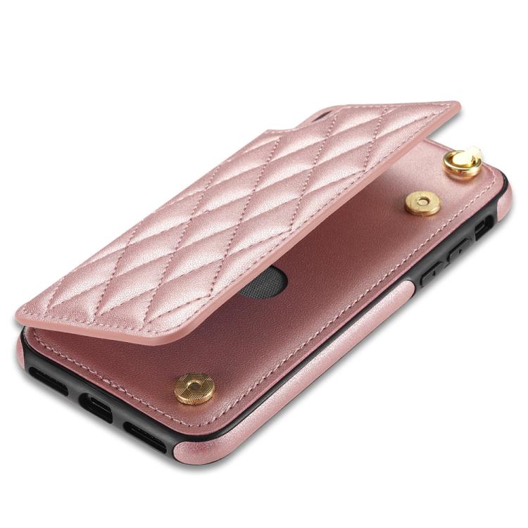 Estuche para Teléfono Rombal iPhone Xr Ranuras Tarjetas Hebilla Doble con Cordón (Oro Rosa)