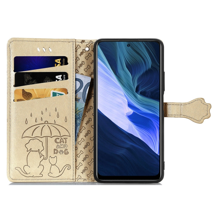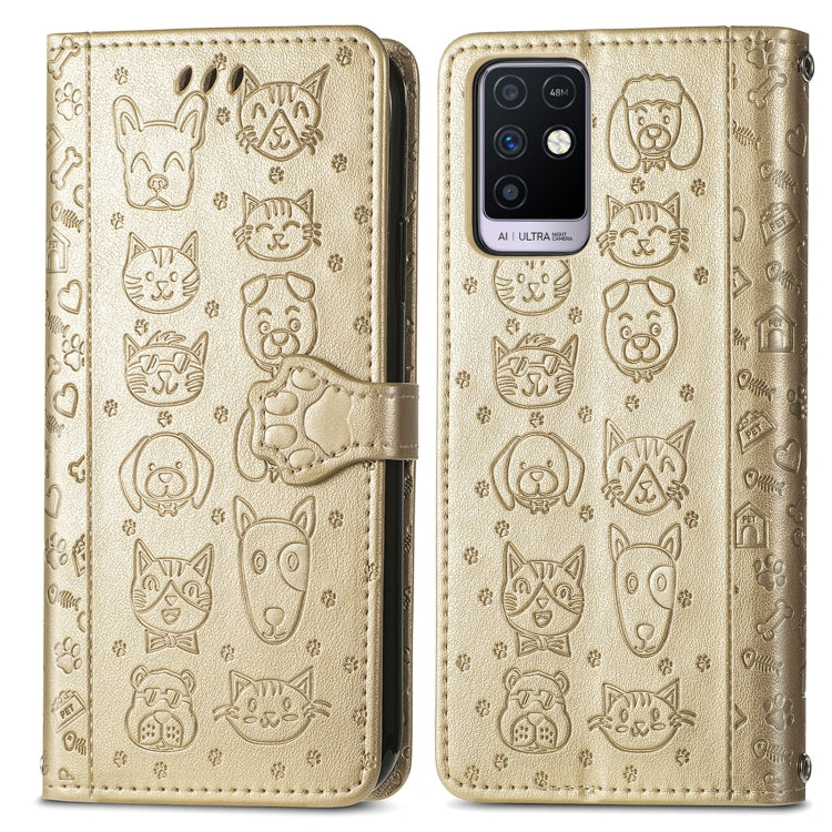 Funda Cuero Horizontal Flip para Infinix Note 10 con Estampado Gato y Perro, Portavillos, Tragamonedas y Cordón (Oro)