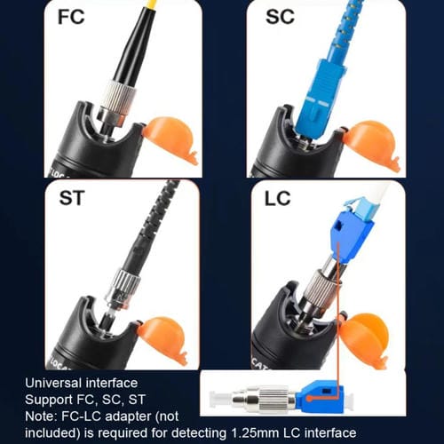 Es compatible con los Conectores estándar FC, SC y ST mediante la interfaz Universal de 2,5 mm.