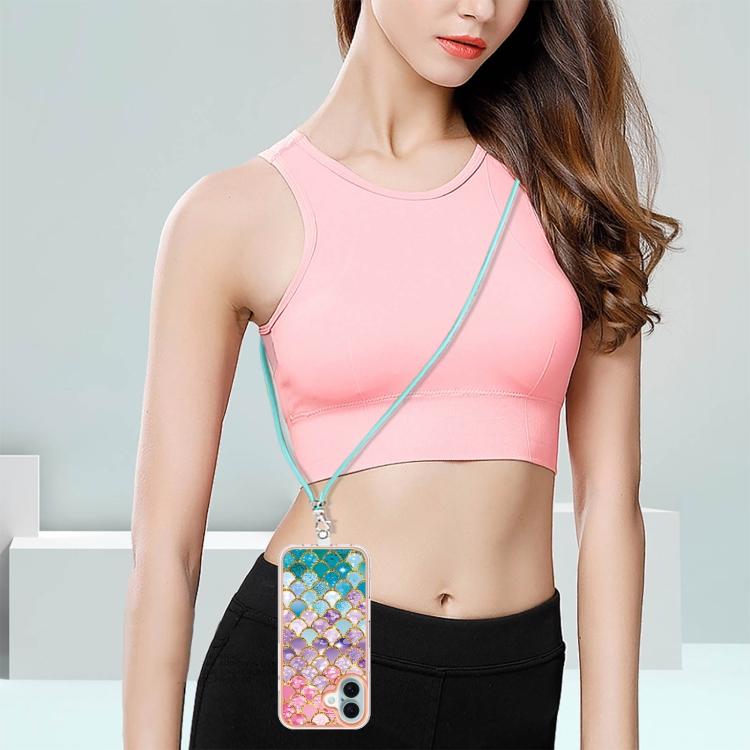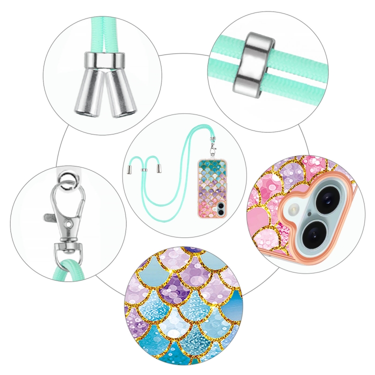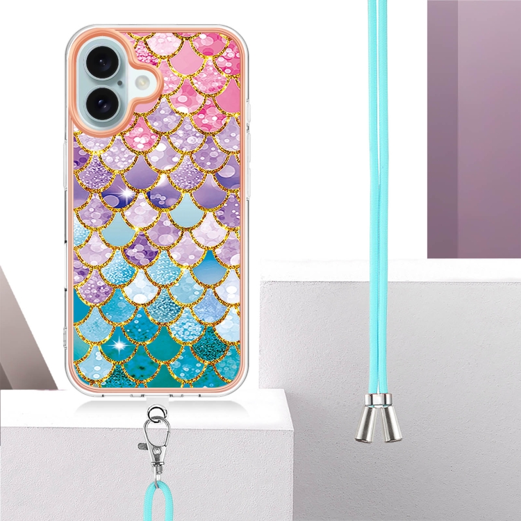 Funda TPU a prueba de golpes con patrón de galvanoplastia IMD para iPhone 16 con cordón para el cuello (Escamas de Colores)