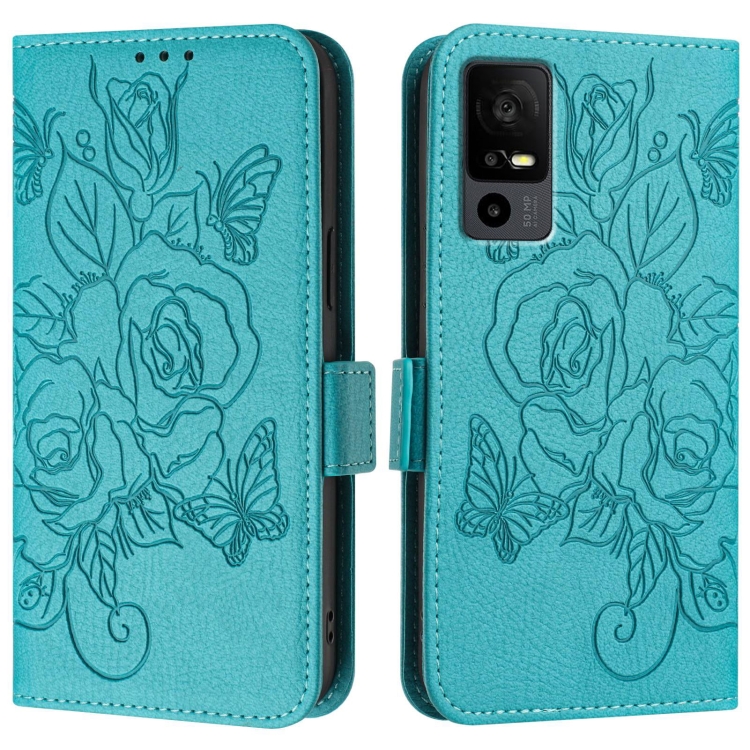 Funda Cuero Antirrobo Rfid para TCL 40R con Diseño Rosa En Relieve (Azul Claro)