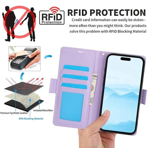 Funda de cuero antirrobo RFID con hebilla lateral para iPhone 17 (morado claro)