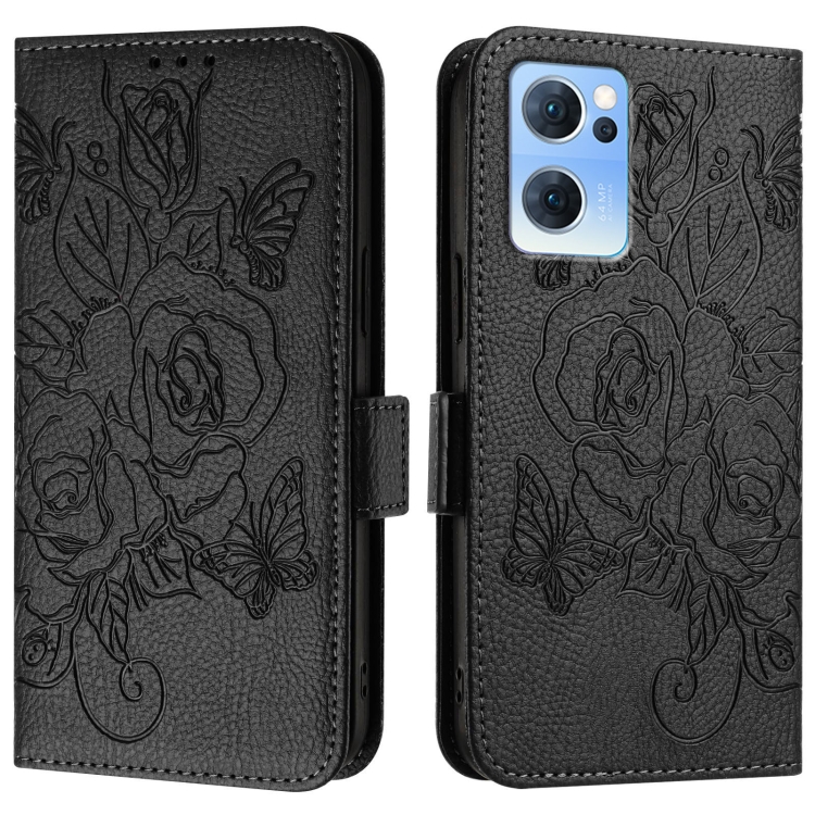 Funda de Cuero Antirrobo Rfid con Relieve En Rosa para Oppo Reno7 5G Global/Find X5 Lite (Negra)
