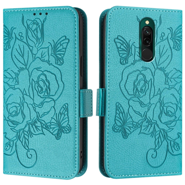 Funda de Cuero Antirrobo Rfid con Relieve En Rosa para Redmi 8 (Azul Claro)