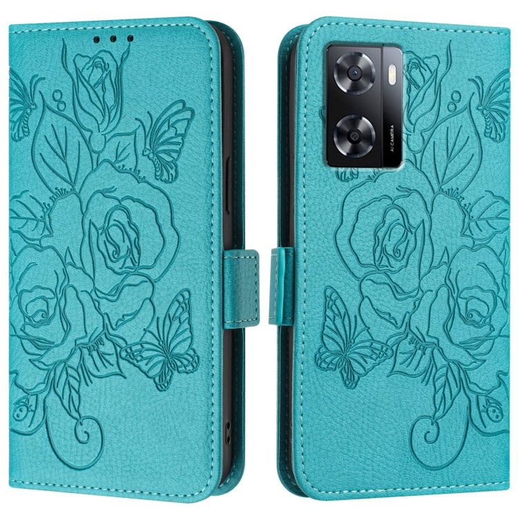 Funda de Cuero Antirrobo Rfid con Relieve Rosa para Oppo A57S 4G / A57E 4G / A77S 4G (Azul Claro)