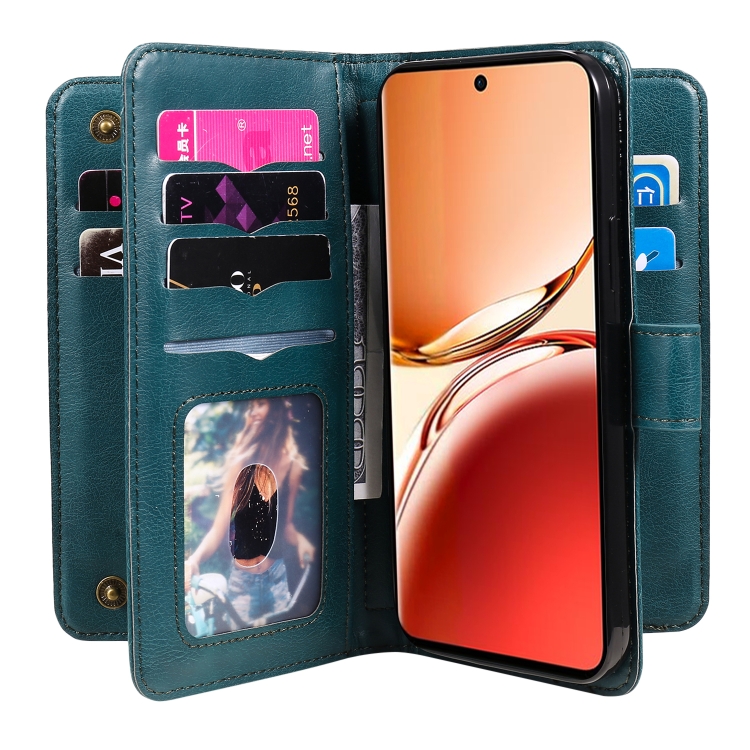 Funda de Cuero con 10 Ranuras para Tarjetas y Billetera Multifunción Global para Oppo Reno12 F 5G (Verde Oscuro)