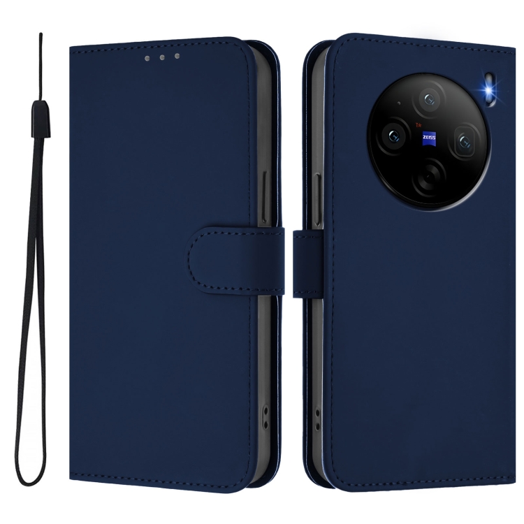 Funda de Cuero con Cordón para Teléfono con Diseño de Piel de Color Liso y Tacto Agradable para Vivo X100S 5G (Azul Marino)