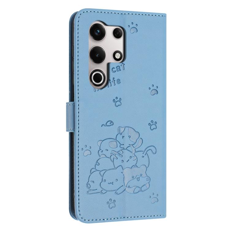 Funda de Cuero con Cordón para Teléfono Itel S25 Ultra con Diseño de Gatito en Relieve (Azul)