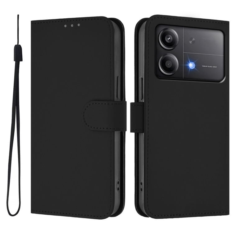 Funda de Cuero con Cordón para Teléfono Xiaomi Poco X6 Neo 5G con Sensación de Piel Global En Color Sólido (Negro)