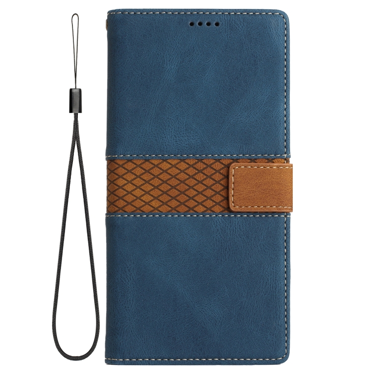 Funda cuero iPhone 14 Pro con costuras en cuadrícula y cordón (Azul)