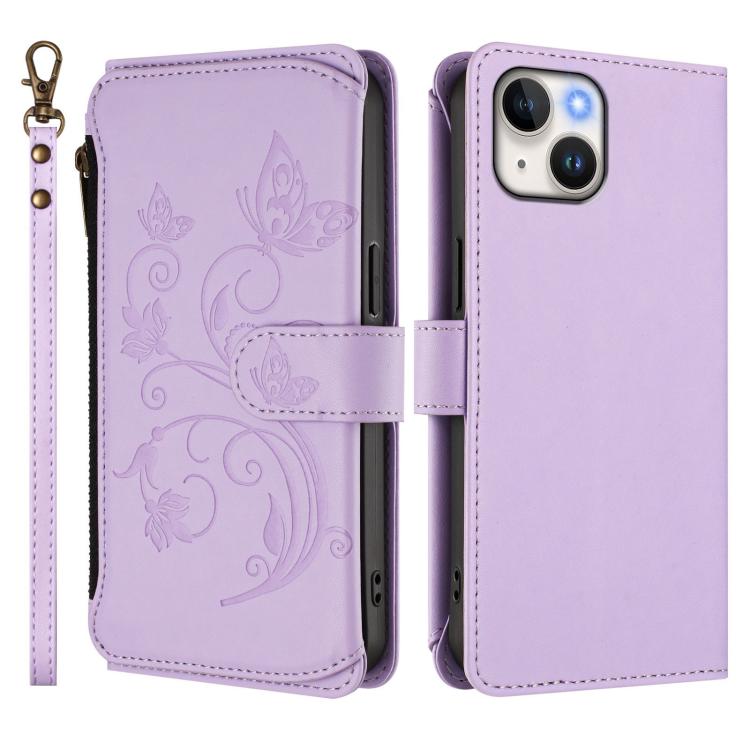 Funda de cuero con cremallera para iPhone 14 Plus, diseño de mariposas, flores y amor (morado claro)