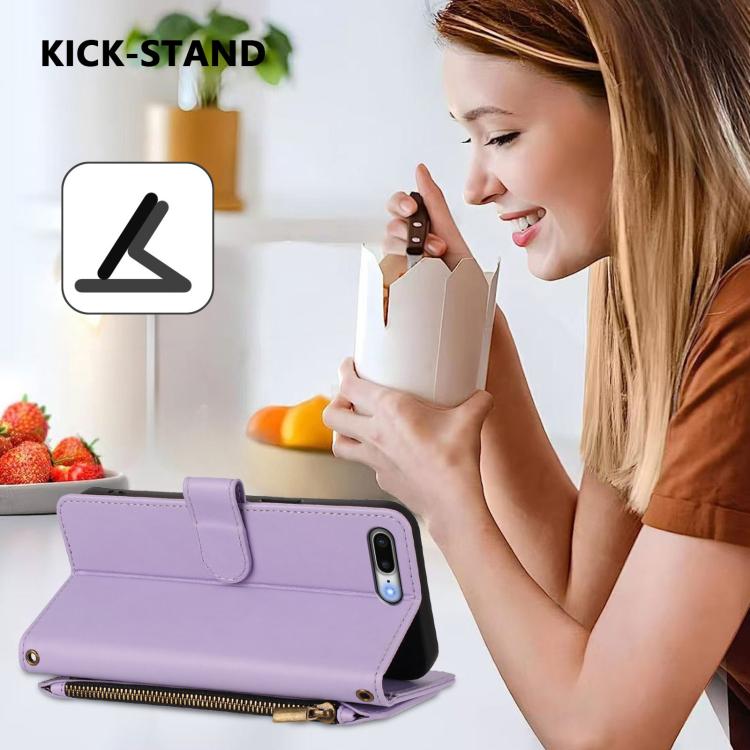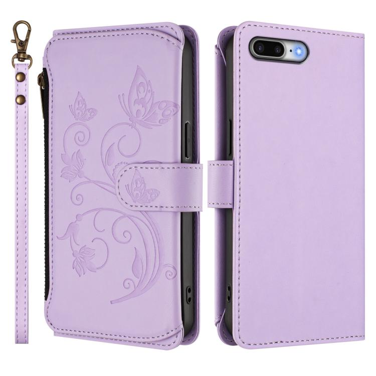 Funda de cuero con cremallera para iPhone 7 Plus/8 Plus, diseño de mariposas, flores y amor (morado claro)