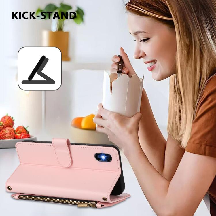 Funda de cuero con cremallera para iPhone X/XS, diseño de mariposas, flores y amor, con múltiples tarjetas (rosa)