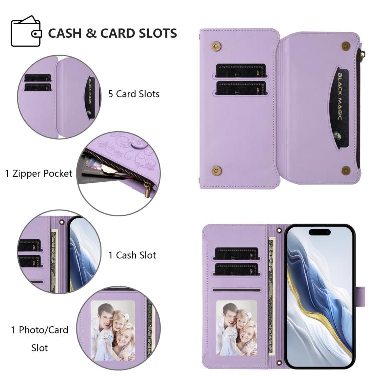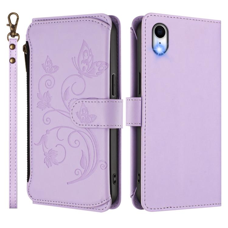 Funda de cuero con cremallera para iPhone XR, diseño de mariposas, flores y amor, con múltiples tarjetas (morado claro)