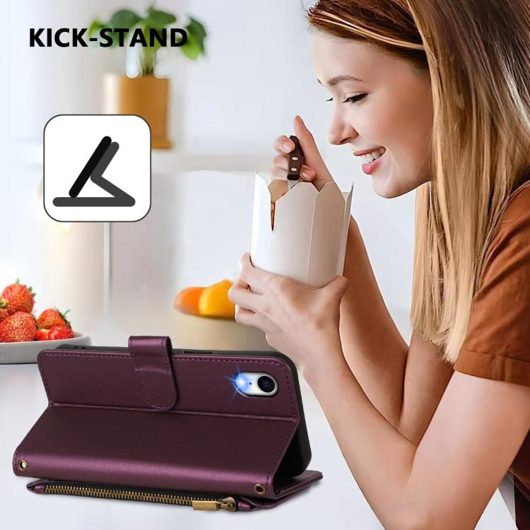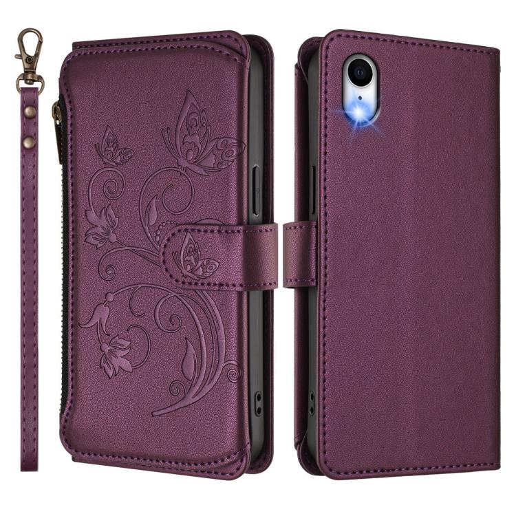 Funda de cuero con cremallera para iPhone XR, diseño de mariposas, flores y amor, con múltiples tarjetas (morado oscuro)