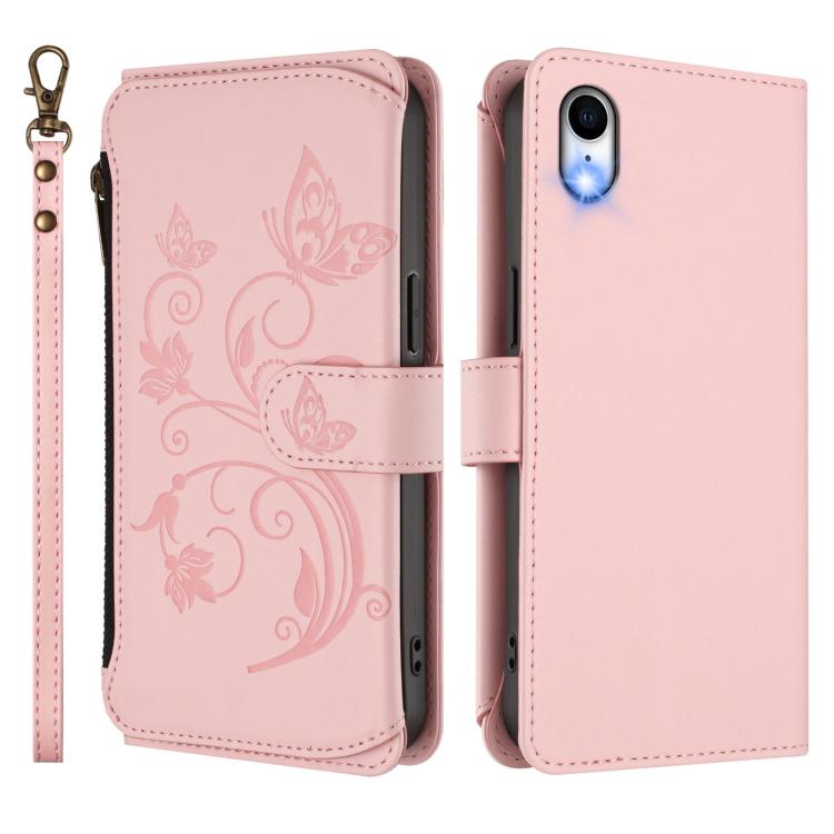 Funda de cuero con cremallera para iPhone XR, diseño de mariposas, flores y amor, con múltiples tarjetas (rosa)